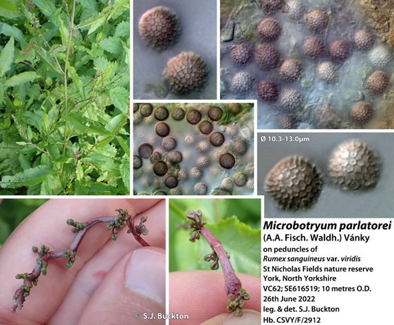 Yorkshire has historically been a hotspot for recording this species, even though it appears to be vanishingly rare elsewhere in Britain and considered ‘very rare’ by Kálmán Vánky in his 1994 tome European smut fungi. The late W. G. Bramley, who wrote the Fungus Flora of Yorkshire 1985, made half a dozen Yorkshire records of the smut between 1936 and 1957. Thereafter it seems to have remained unrecorded in Britain until Robert Maidstone spotted it in Wacton, Norfolk in 2003 on Wood Dock. But it was finally re-recorded in Yorkshire in 2022 on 26 June, when Sam was walking along the bank of Tang Hall Beck at St Nicholas Fields (colloquially known as ‘St Nicks’), a small and unassuming 10-ha urban nature reserve in the heart of York. He noticed a patch of Wood Dock along the bank with swollen, reddened and ‘zigzaggy’ stems; sure enough, opening up the galls revealed the brown spores of M. parlatorei. Yorkshire’s Fungi Recorder Chris Yeates has since made a beautiful montage of images showing the host, galls and reticulated (netted-looking) spores (see above). There is a relatively cool and damp microclimate along the Beck, which might be one of the reasons why this elusive smut decided to take up residence here. St Nicks can now claim to be a site of national, if not European, importance for this smut. Nonetheless, we can all keep an eye out for it – perhaps we’ve been overlooking it in some areas, as is easy to do with many of the parasites on living plants, and on docks especially, those most commonplace of weeds that we pass by all the time without a second thought. There are other species of Microbotryum to look out for too on other plants – many of them attack the anthers of flowers (e.g. of campions Silene spp.), making them produce dark powdery smut spores in place of pollen.