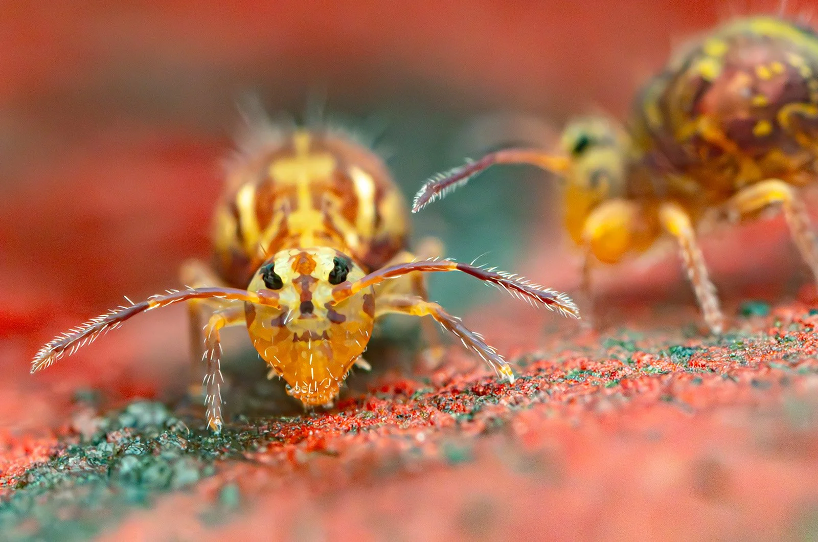 To the naked eye, springtails might seem unremarkable. Ranging in size from just 0.2mm (Megalothorax minimus) to around 6mm (Pogonognathellus longicornis), they are so small that spotting them can be quite a challenge. Yet, the macro lens enables Tim to peer into their tiny worlds, revealing a vast array of shapes, sizes, colours, and behaviours. Dicyrtomina saundersi is about 2–3mm in size and belongs to the order Symphypleona, also known as the globular springtails due to their round body shapes. Its body is a colourful patchwork of pale yellows and maroons with a dark multi-barred cross on the rear of the abdomen, which can be used for identification. It has a distinct head featuring antennae and retracted mouthparts for sucking or chewing, along with two clusters of simple eyes (ocelli). The segmented antennae are equipped with sensory structures, such as bristles and pores, that allow the springtail to detect vibrations, air movements, and chemical cues for finding food, mates, and navigating its environment. In Dicyrtomina saundersi, the antennae tend to change colour from yellow to maroon, which is another identifying feature.