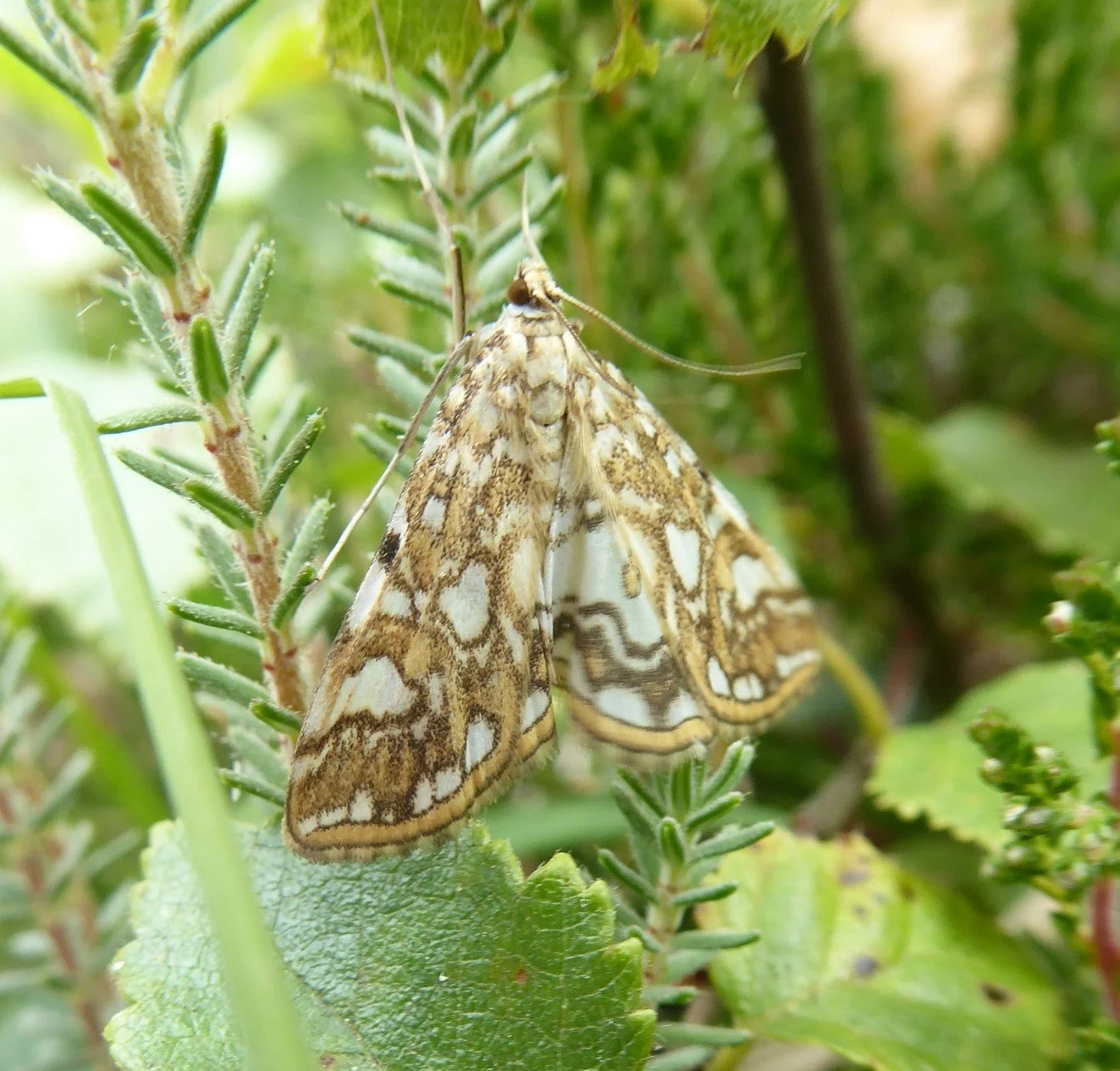 Dick’s chosen species is the Brown China-mark, Elophila nymphaeata, a large micromoth. It is fairly common and fairly widespread in Yorkshire, particularly around ponds, lakes and canals. Adults have a wingspan of 22-30mm and are mostly recorded flying in July and August. They are quite variable in appearance; some individuals are dark and dull-looking compared to others with distinctly patterned brown and white/cream wings. Females are larger and paler than males.