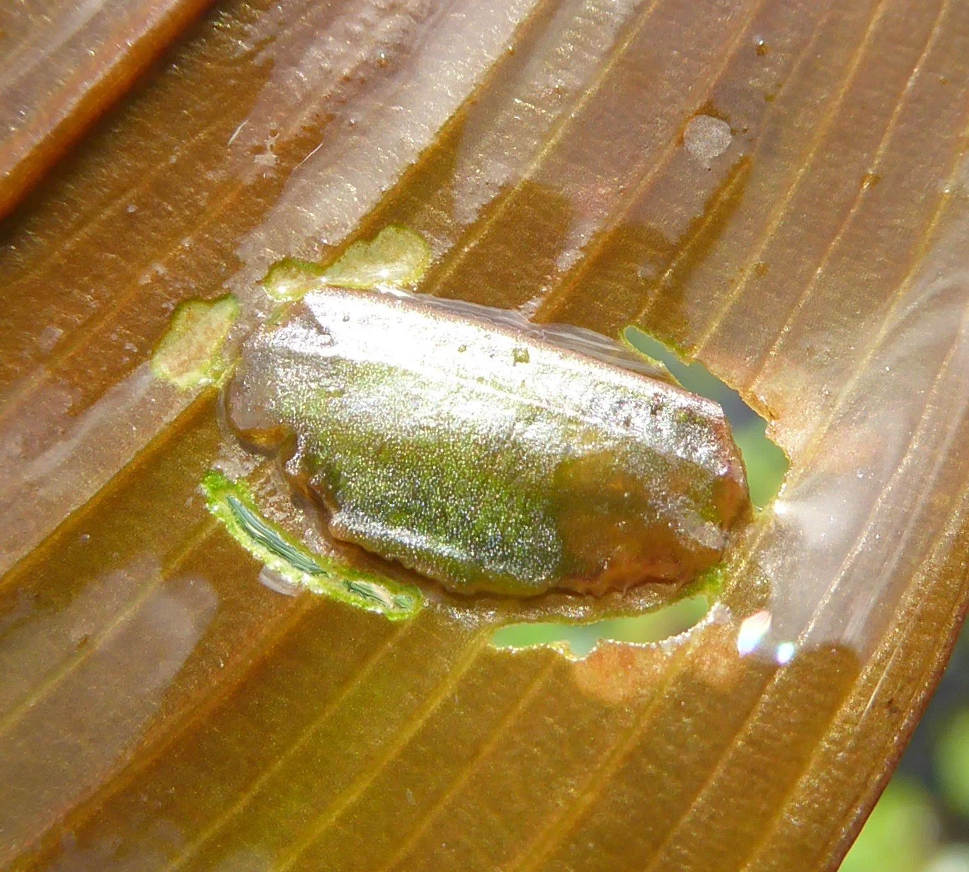 2a. Larval case of Brown China-mark attached to underside of leaf of Broad-leaved Pondweed