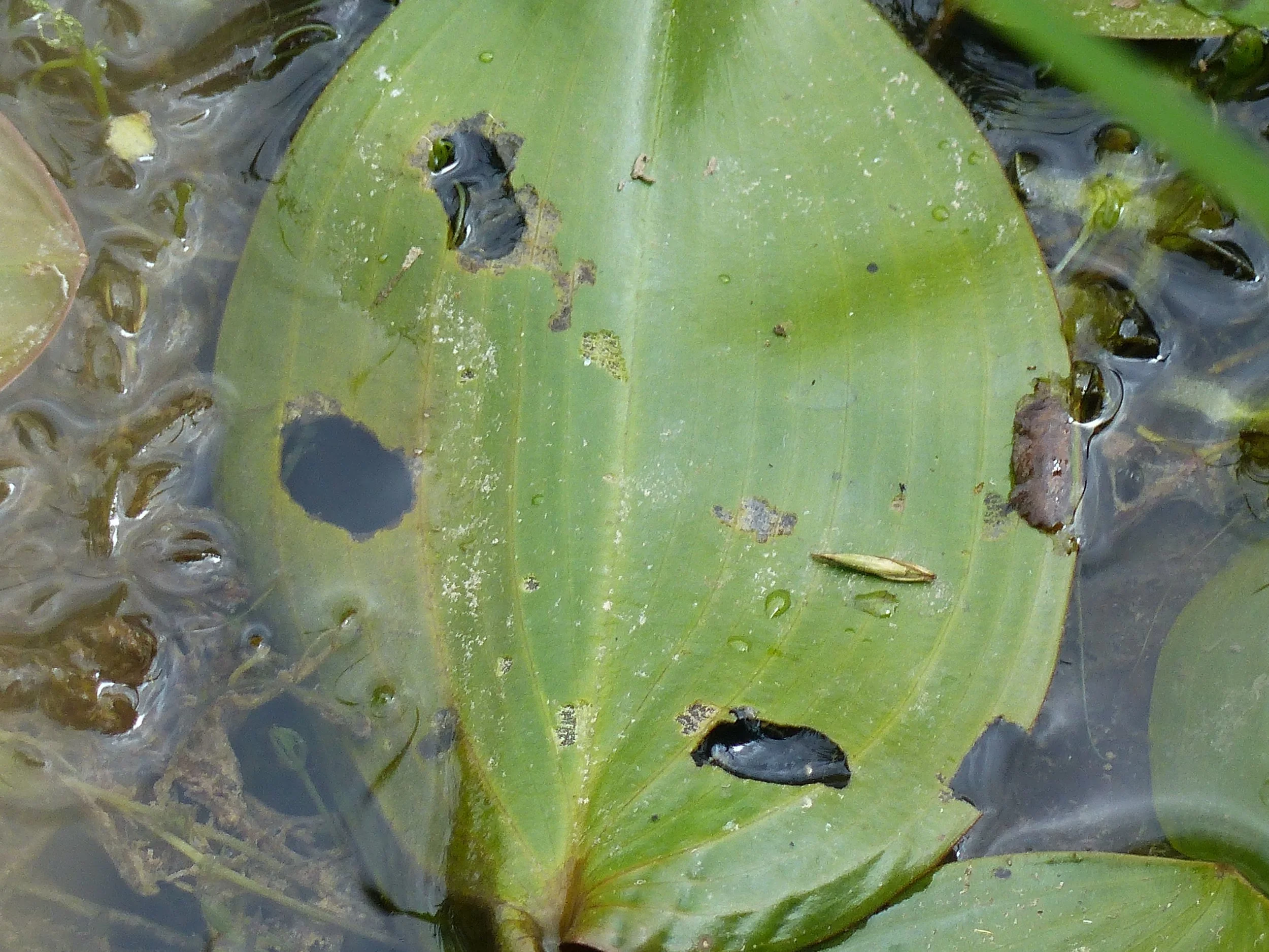 3 Leaf of Broad-leaved Pondweed with oval holes. Each hole is considered to be due to a Brown China-mark larva cutting out a piece a leaf to construct a case. Note an apparent moth larval case on the edge of the leaf.