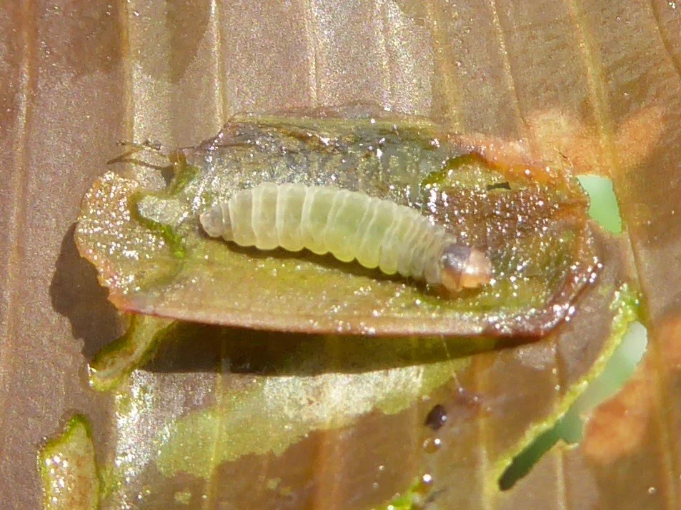 Small China-mark (Cataclysta lemnata): Uncommon and local resident. Larva, with probable blood gills, lives in a case of leaf fragments, mainly under duckweed.
