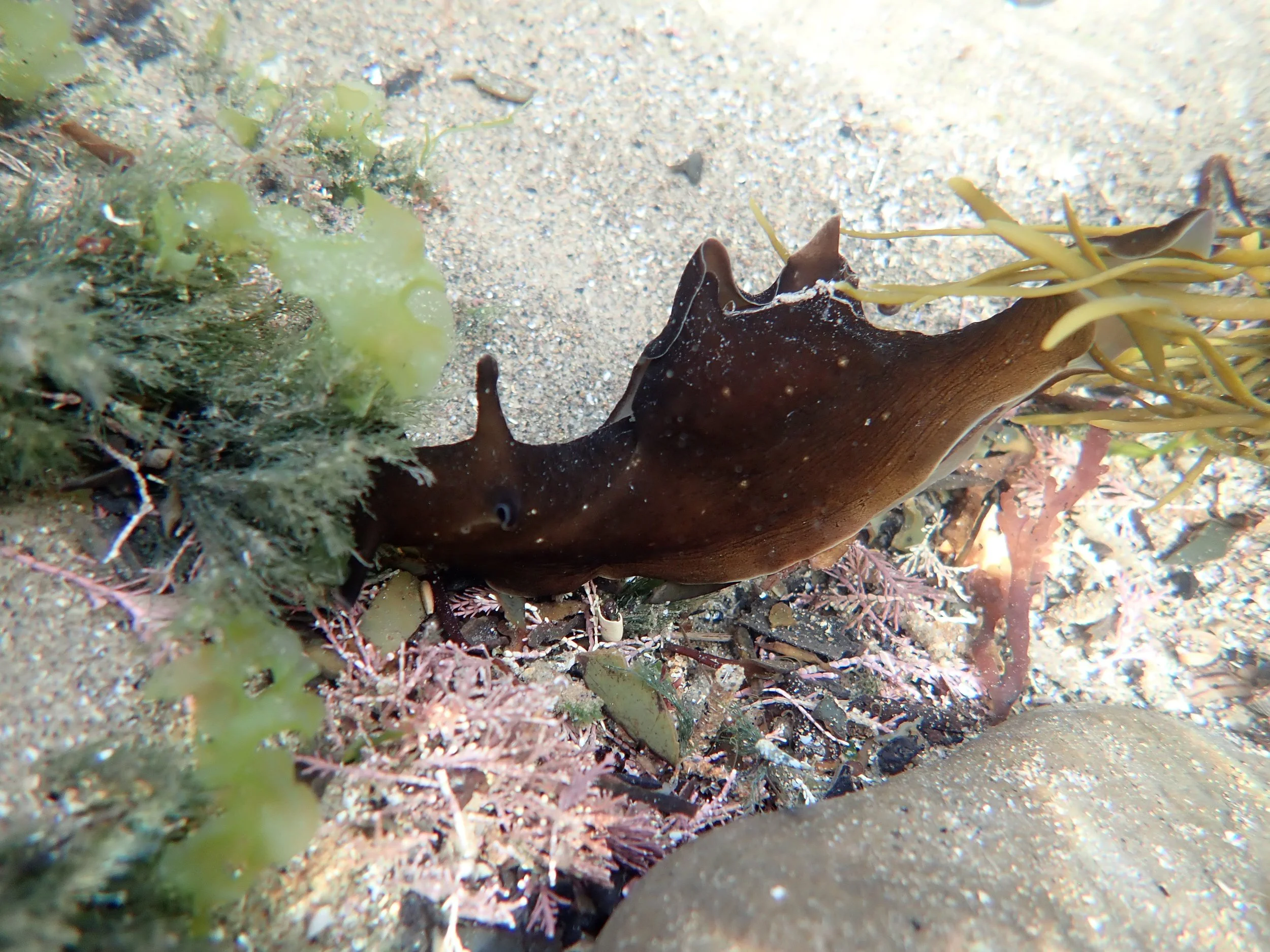 Sea Hares are soft marine gastropods (snails), within the family Aplysiidae. Whilst they might look more like a slug, the Sea Hare does have a shell. Instead of being on its back, which has instead been reduced to a flat plate or ridge, its actual shell is around 4cm, almost transparent, and internal rather than external. They also have tentacles on their heads, considered not unlike hares' ears, giving them their common name. They generally range in size from 7-20cm in length but tend towards the smaller end of this scale. They come in a variety of colours, favouring weedy coastal waters all around the UK.