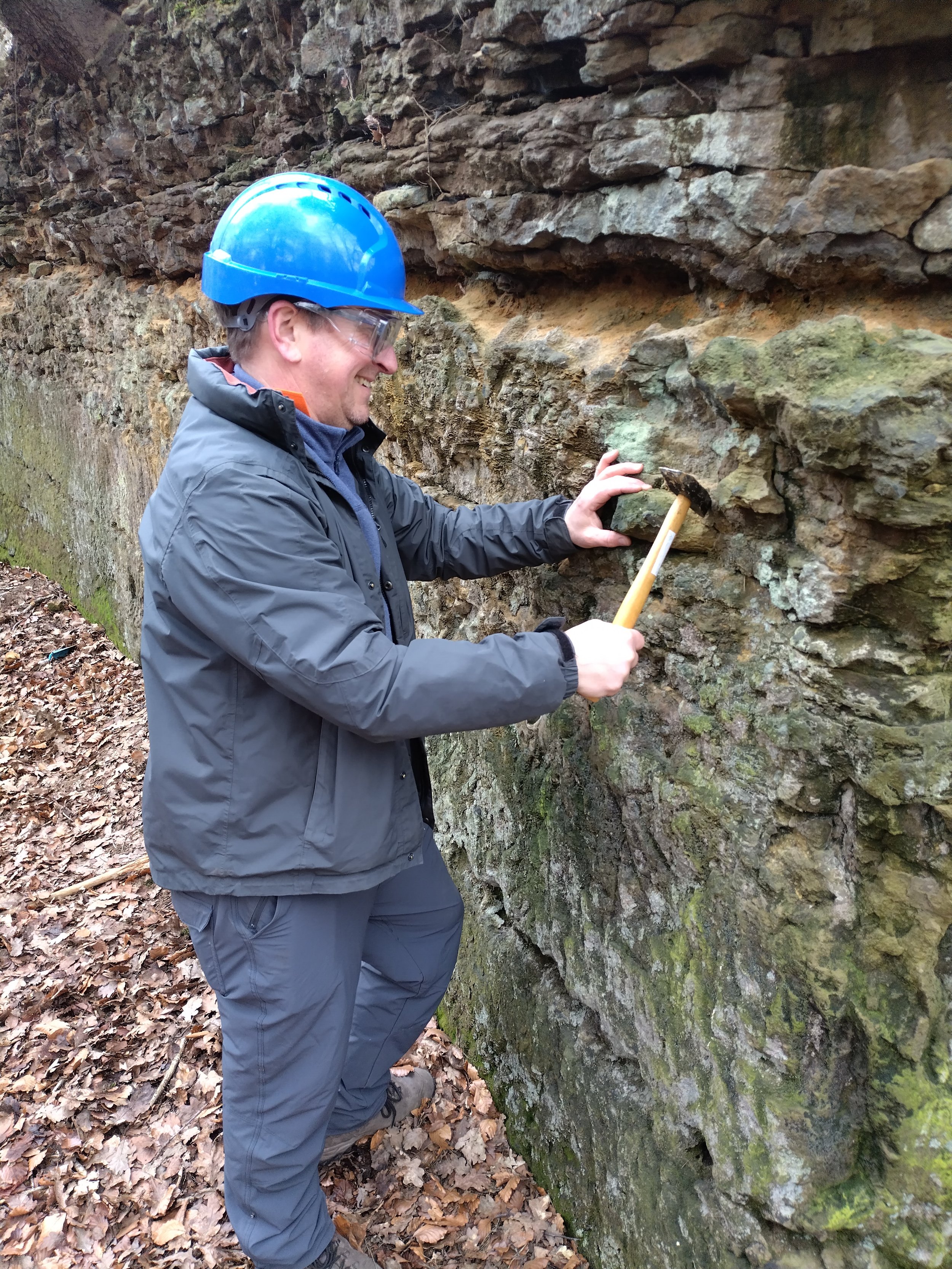 Kitted out with hard hats, safety goggles and a geological hammer Clare and Mark set off for Park Wood Quarry – a site which we believe has not been quarried for its sandstone since the mid-19th century. A fantastic site with gnarled and deformed trees (mainly beeches) growing out of the abandoned quarry face and an interesting section that had never been worked awaited us. The unworked section had a single clear face that allowed for the four possible strata, and a layer of loose sediment, to be easily sampled.
