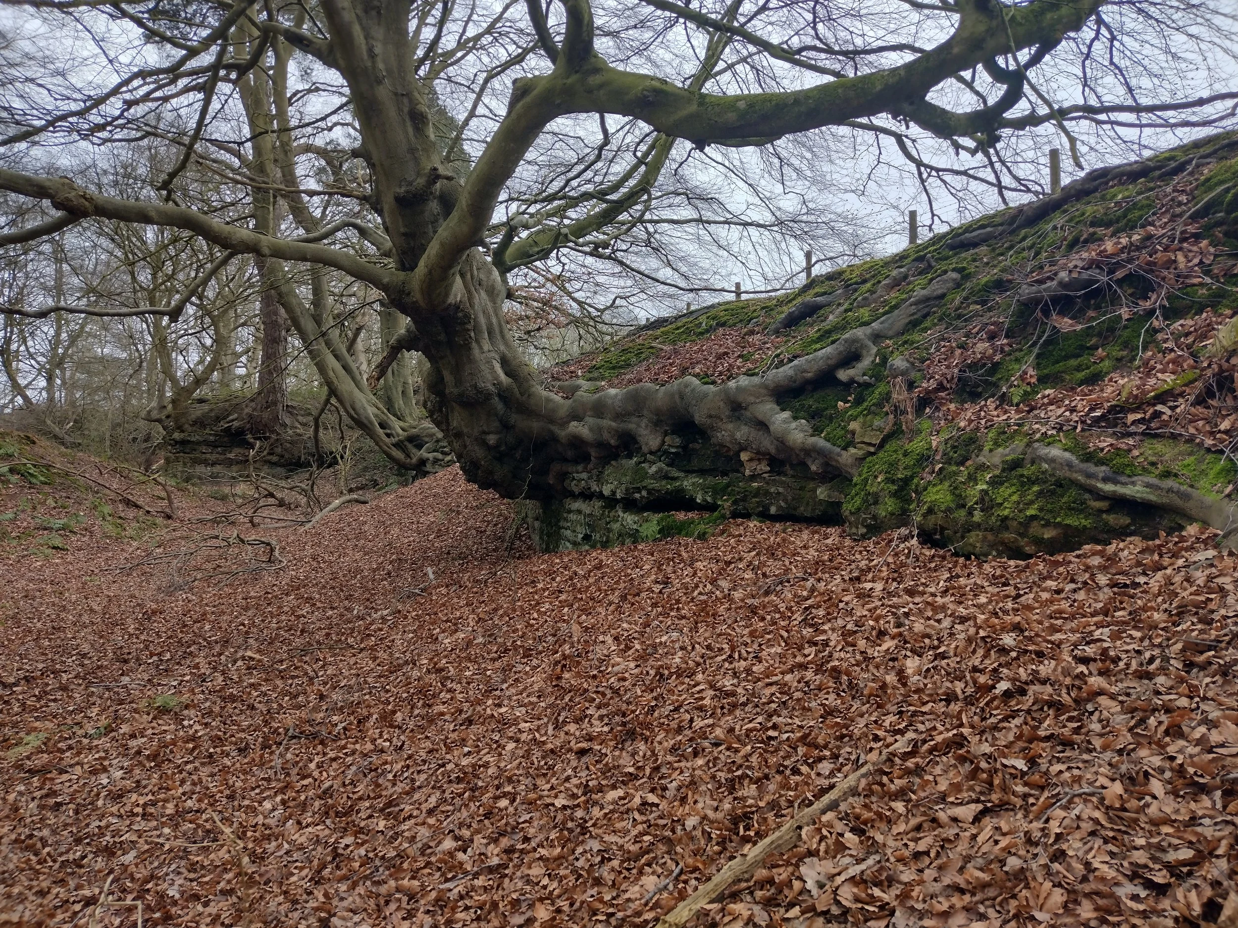 Gnarled beech tree growing out of the rock face
